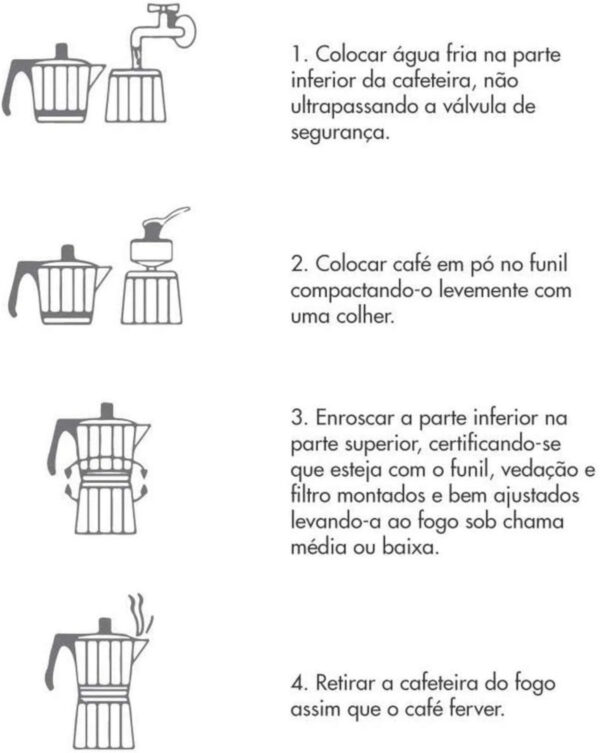 Basta adicionar água, colocar o pó, encaixar as partes e levar ao fogo em poucos minutos, o café está pronto, fresco e saboroso. Todo o processo é rápido, econômico e sustentável, pois dispensa filtros de papel e cápsulas.