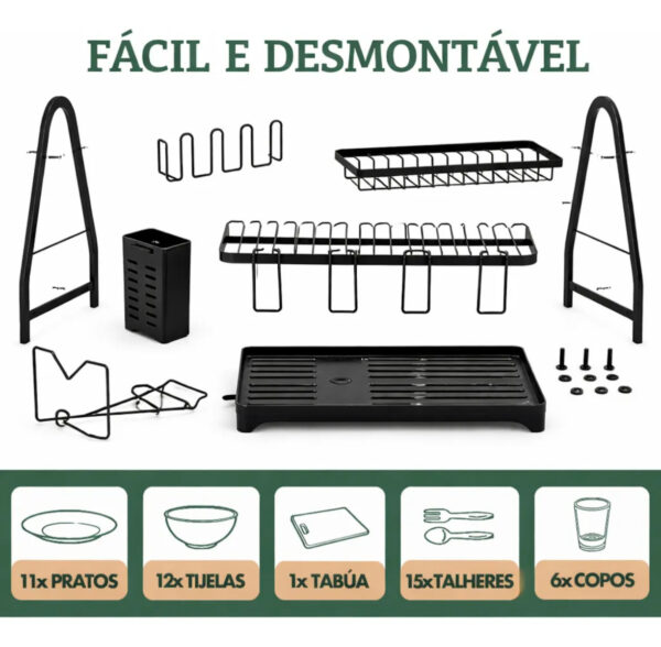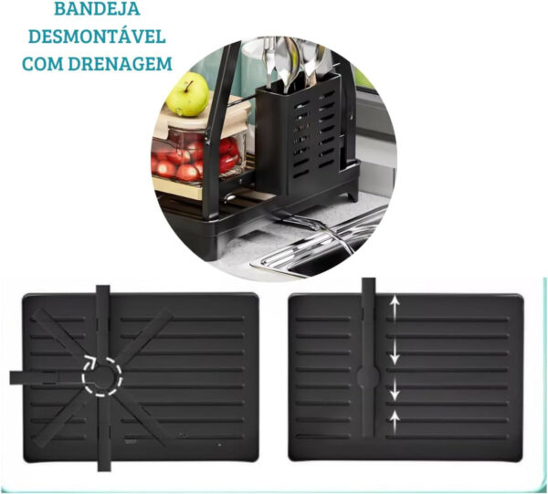 O modelo conta com bandeja coletora desmontável, facilitando a limpeza e a manutenção no dia a dia. Seu formato otimiza o espaço, permitindo acomodar diferentes tipos de utensílios de forma organizada.