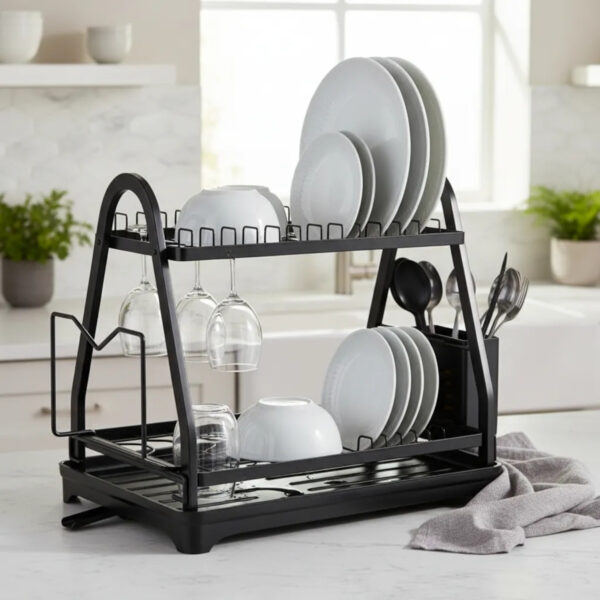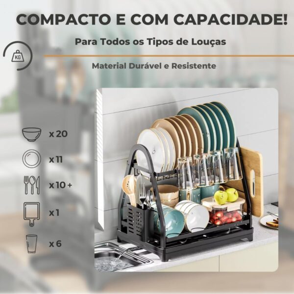 Escorredor de louca de dois andares, ideal para organizar sua cozinha com praticidade, elegância e eficiência. Fabricado em estrutura resistente, possui design moderno e sistema de drenagem que direciona a agua diretamente para a pia, mantendo a bancada sempre seca.