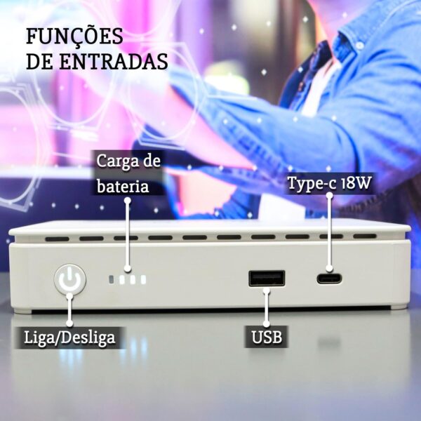 A duração exata com todas as portas em uso dependerá da carga total conectada. Com a capacidade total de 56.61Wh, se todos os dispositivos conectados somarem até 35W, o UPS pode manter a operação por aproximadamente 1.6 horas*.