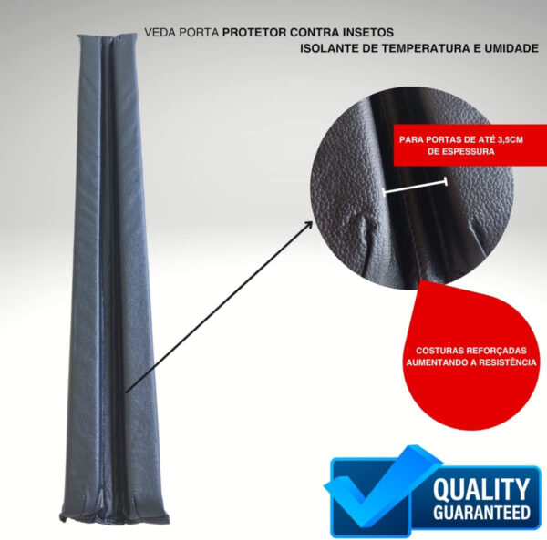 Fabricado em PVC e polietileno expandido, impermeável, com proteção dupla (externa e interna), possui 80 cm de comprimento, altura de 3 cm e o espaço entre os rolinhos de 3,5 cm. Para instalar, é necessário inserir o veda porta embaixo da porta de 0,5 cm entre a mesma e o chão.